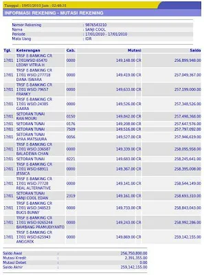 Pertanyaannya . Anda yakin itu benar rekening mutasi dia ? . Sebab saya pun bisa membikinnya hanya dalam hitungan detik . Tinggal di capture dan di tempel di Situs bisnis sebagai bahan untuk meyakinkan orang . Selesai . Mudahkan ! .